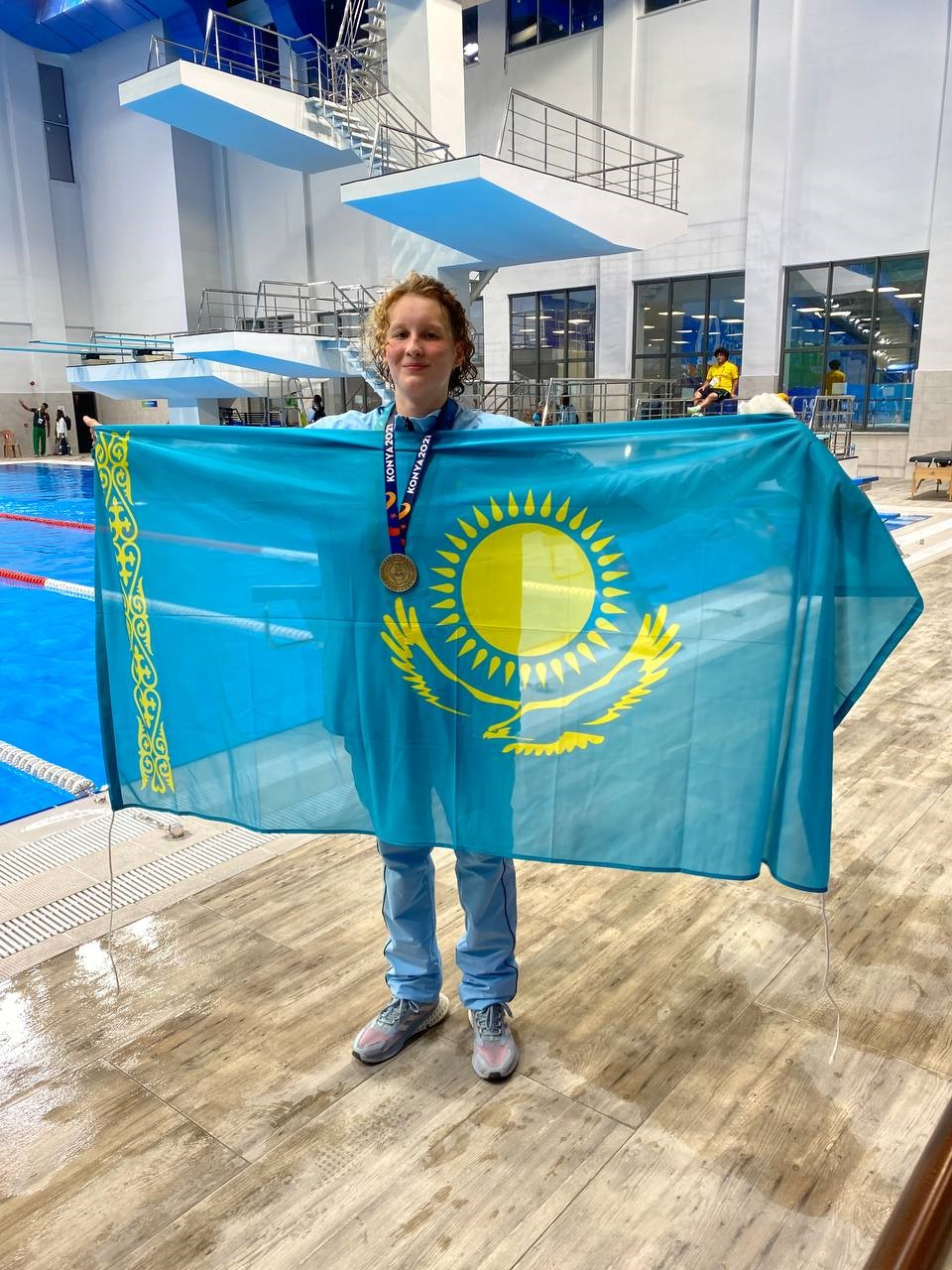 “ Занимаюсь плаванием уже больше одиннадцати лет. Я мастер спорта и рекордсмен Казахстана, три раза была призером чемпионата Азии, чемпион Исламских игр. И пока что все.Так скромно относится студентка к своим успехам.