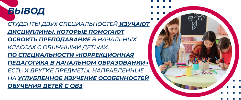 | У студентов специальностей «Преподавание в начальных классах» и «Коррекционная педагогика в начальном образовании» есть общие профильные дисциплины: | Профильные предметы, которые есть только по специальности «Коррекционная педагогика в начальном образовании»: |