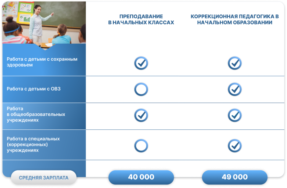 Основная деятельность — преподавание в начальных классах. Вы в любом случае будете учителем начальных классов: сможете преподавать школьникам 1-4 классов.
