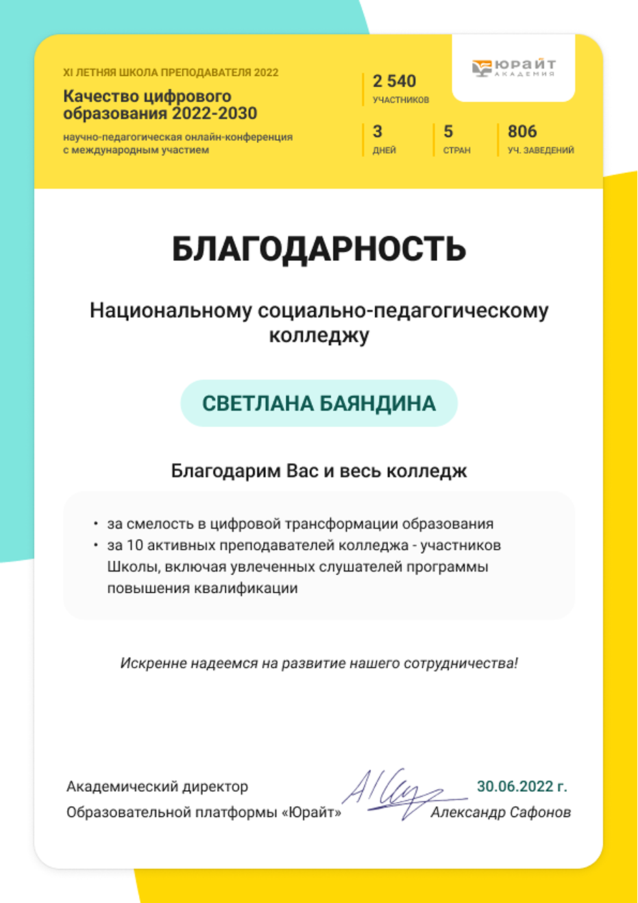 Юрайт.Академия и организационный комитет XI Летней школы преподавателя «Качество цифрового образования 2022—2030» (27—29 июня 2022 г.) — педагогической научно-практической онлайн-конференции с международным участием — благодарят Национальный социально-педагогический колледж за активное участие 10  преподавателей в самой Школе и в реализуемых в ее рамках программах повышения квалификации.